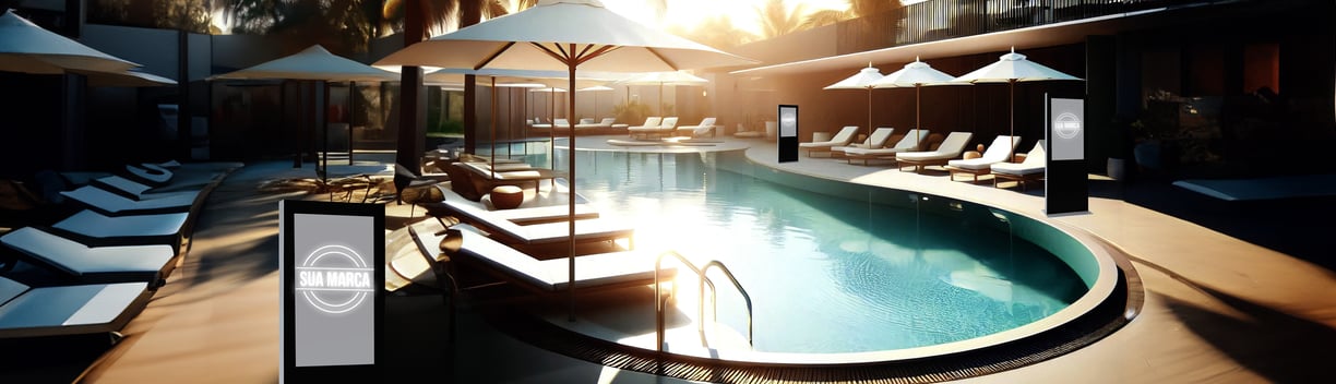 - 2 Painéis Digitais de, aproximadamente, 1mX0,50m (tamanho de uma TV de 42” na posição vertical) colocados à beira da piscina – visualização em modo randômico constante com compartilhamento de espaço apenas com os outros 3 PATROCINADORES MASTER – os 4 Patrocinadores Master reinando absolutos em 2 painéis digitais durante todo o tempo à beira da piscina.